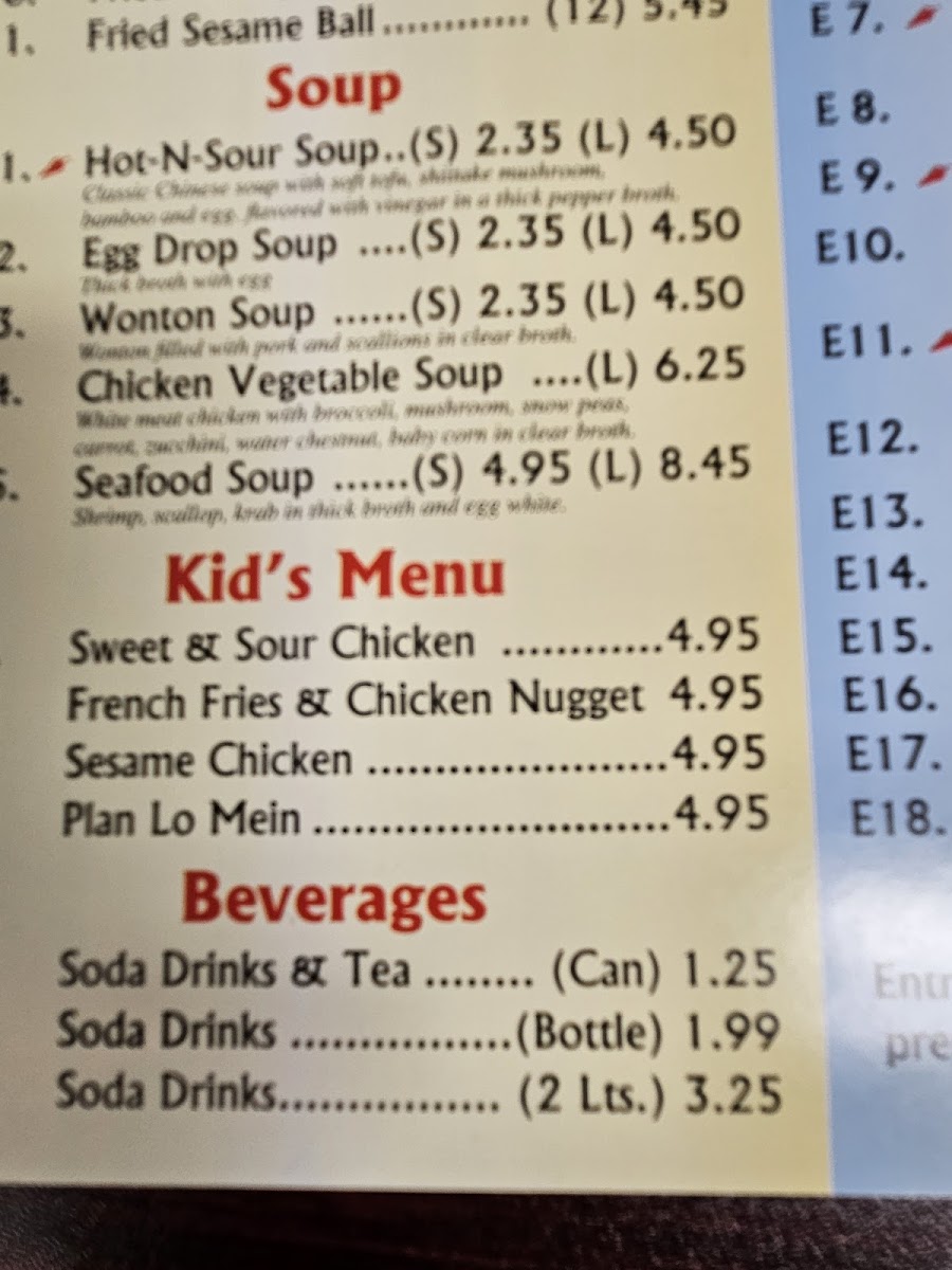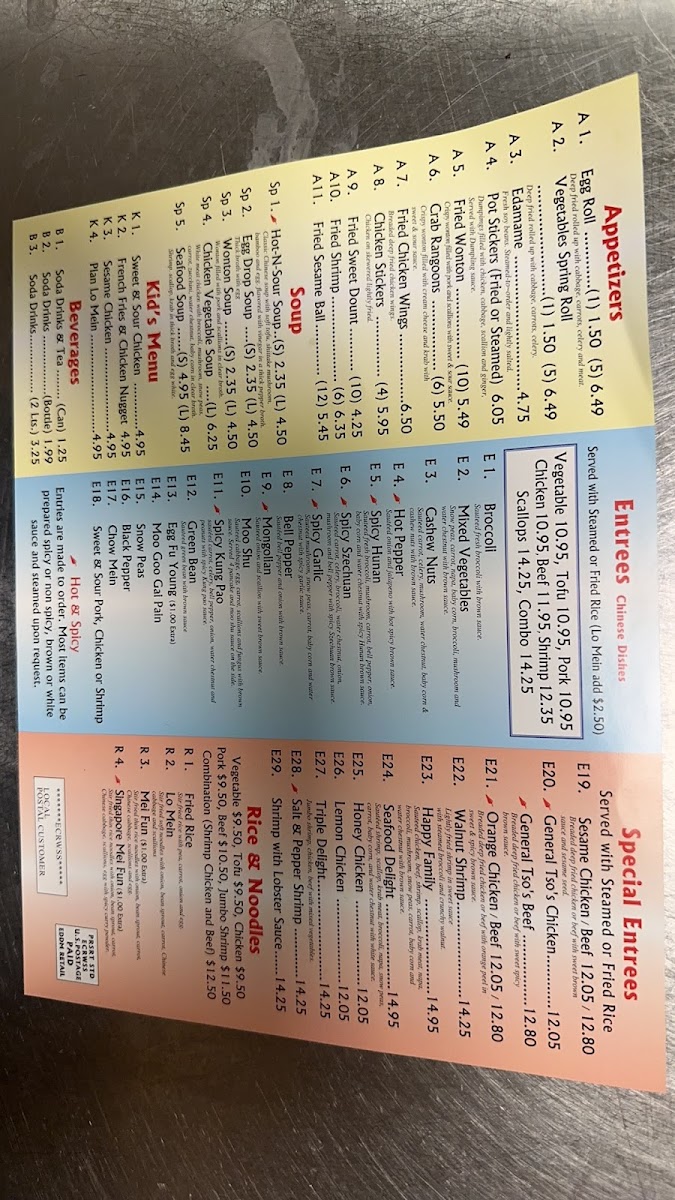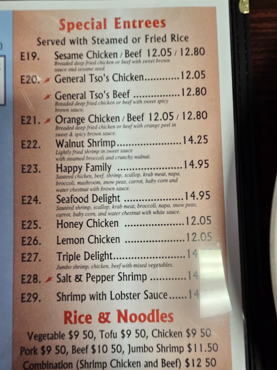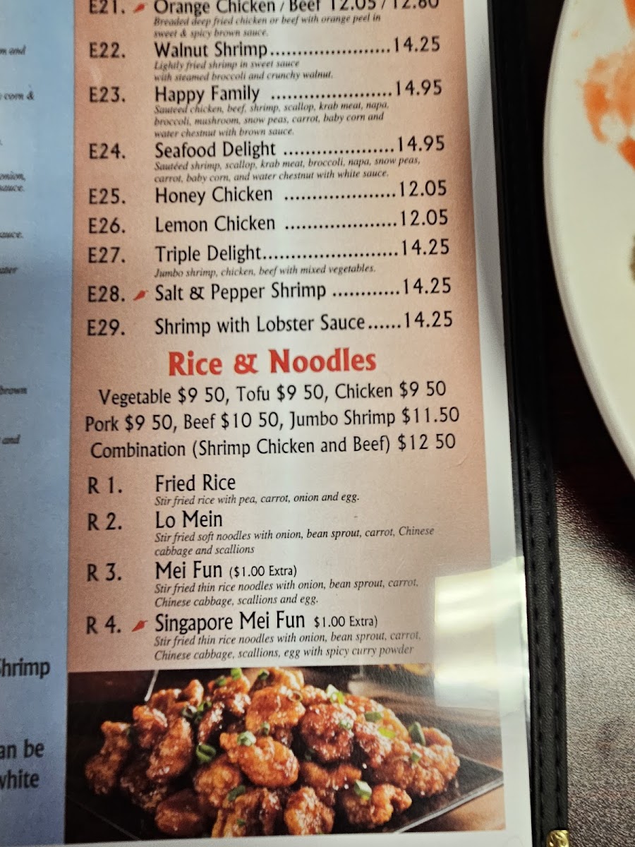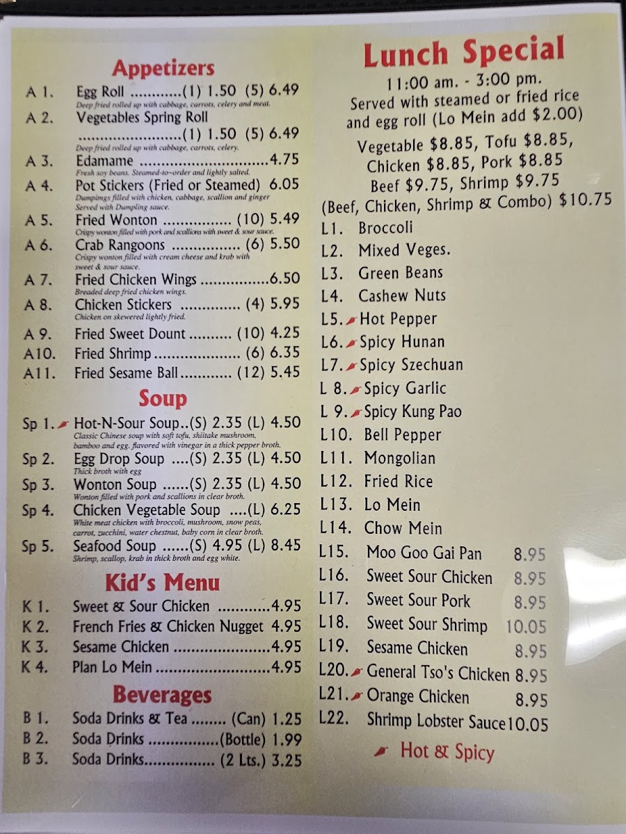 From a reviewer’s perspective, the menu at Golden City offers a well-rounded selection that covers all the classic Chinese takeout favorites at reasonable value, especially through the lunch specials like L1. Broccoli, L2. Mixed Veges, L3. Green Beans, L4. Cashew Nuts, and L5. Hot Pepper. The appetizers such as A1. Egg Roll, A2. Vegetables Spring Roll, A3. Edamame, A4. Pot Stickers, and A5. Fried Wonton (10) provide familiar starters, while comforting soups like SP1. Hot & Sour Soup, SP2. Egg Drop Soup, and SP3. Wonton Soup round out the lighter options. For main dishes, staples like E1. Broccoli, E3. Cashew Nuts, and E5. Spicy Hunan sit alongside popular favorites in the special entrées section, including E19. Sesame, E20. General Tso’s, and E21. Orange, with E22. Walnut Shrimp and E23. Happy Family offering more premium choices. The menu is completed with classic sides like R1. Fried Rice, R2. Lo Mein, and R3. Mei Fun, plus a simple kid’s menu and beverages, making it a straightforward, satisfying menu with something for everyone.