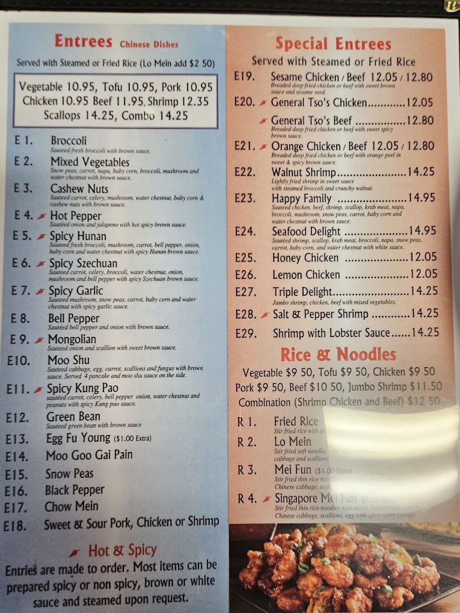 Hot pepper stir-fry with choice of vegetable, tofu, chicken, pork, beef, shrimp, or combo. Served with steamed rice, fried rice, or lo mein.