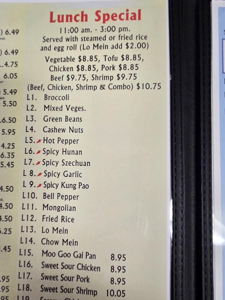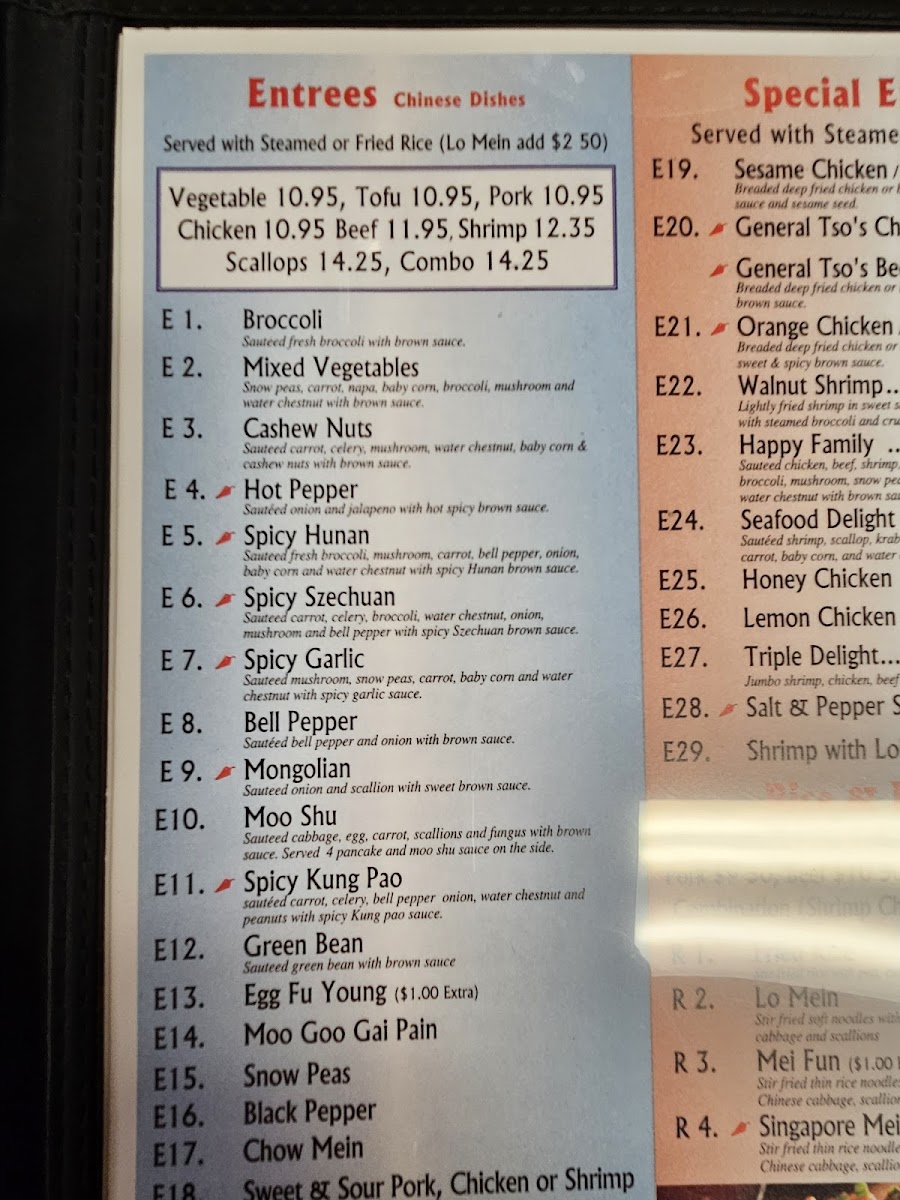 Spicy Szechuan with options for Vegetable, Tofu, Chicken, Pork, Beef, Shrimp, or Combo. Served with choice of Steamed Rice, Fried Rice, or Lo Mein.